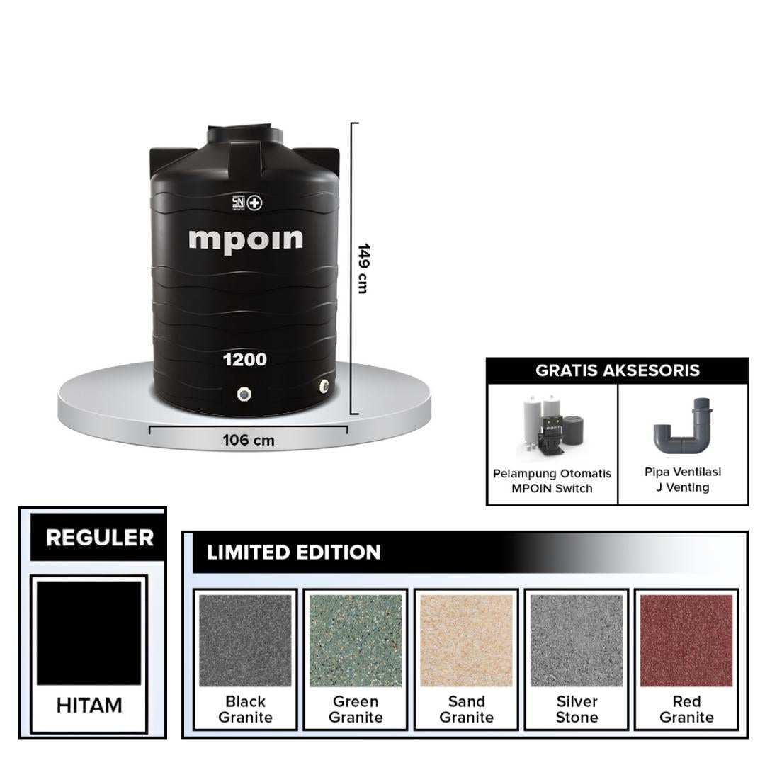 1150 L / MPOIN + WAVE W1200 Water Torrent Tangki Tandon Air PVC Black + Acc Set